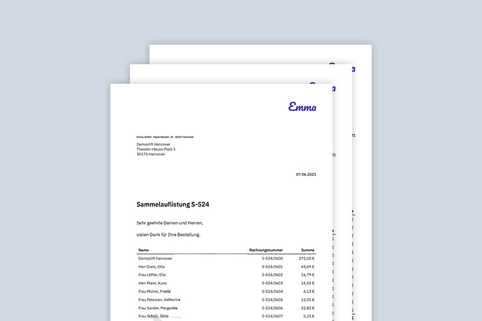Ihre Buchhaltung bekommt von Emma eine übersichtliche Abrechnung, bereits aufgeschlüsselt nach einzelnen Bewohner*innen und an Ihre Anforderungen angepasst.