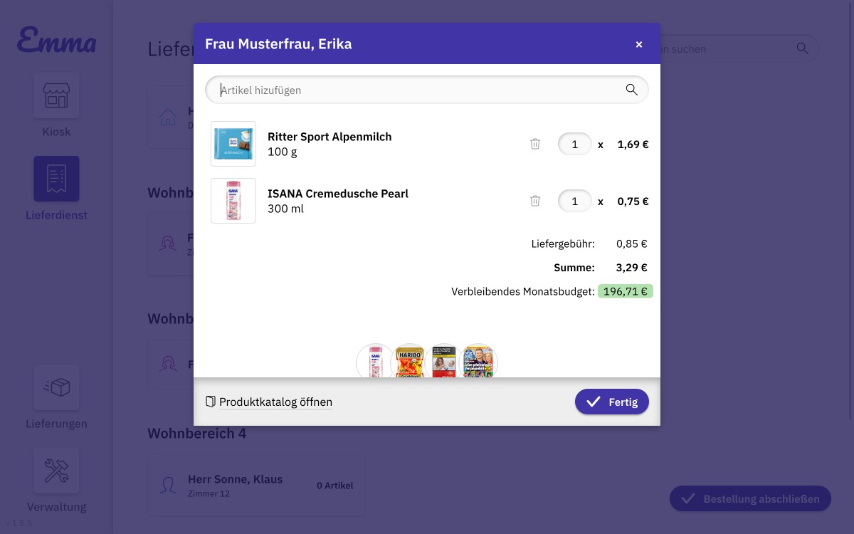 Produktkatalog anfordernEin selbstbestimmtes Leben ist ein hohes Gut – gerade im Alter. Der Emma Lieferdienst ermöglicht Ihren Bewohner*innen, wieder am Einkaufsleben teilzuhaben. Und das bekommen Sie in Form von Lebensfreude zurück.